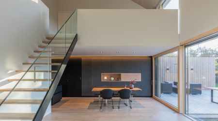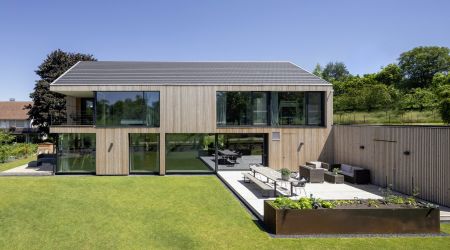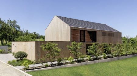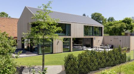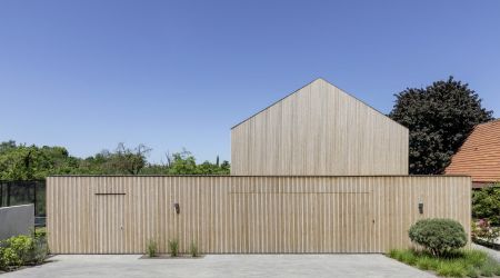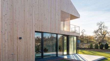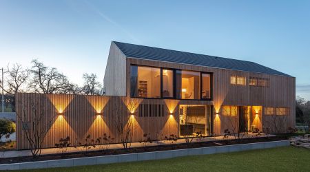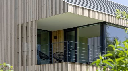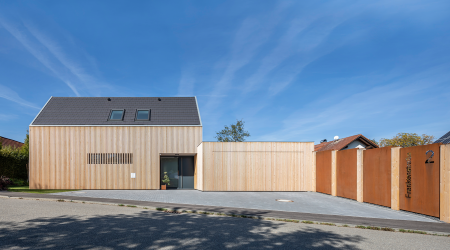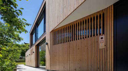 Wo Außenwirkung auf Funktionalität trifft: eine stromlinienförmige Lattung aus Weißtanne sorgt bei diesem Haus für einen nahtlosen Übergang von Wohnbereich zu Garage und Gerätehaus.