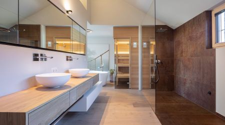 Holzständerbauweise 240 mm mit Holzfaserdämmung + 60 mm Holzfaserplatten außen.
