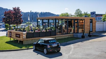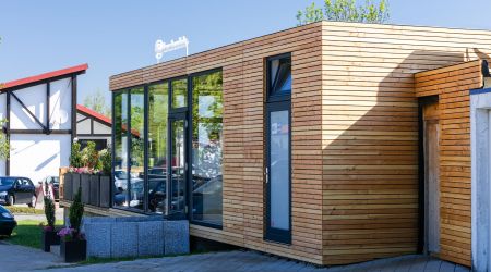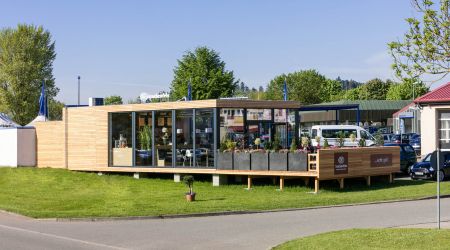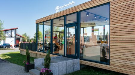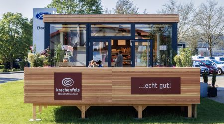 Das Wohnkubuskonzept von Schwarzwälder eignet sich auch hervorragend für leichte und unaufwendige Bauten, welche z.B. nur für eine gewisse Zeit aufgebaut werden. So entstand in Rottweil ein eingeschossiger Backshop, welcher als temporärer Ersatz für ein anderes, im Umbau befindliches Gebäude, genutzt wurde.