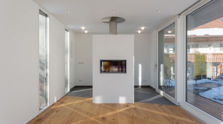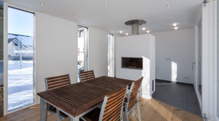 Freizeitkubus mit Küchenzeile und Kaminofen.