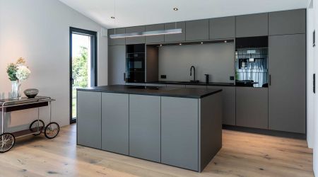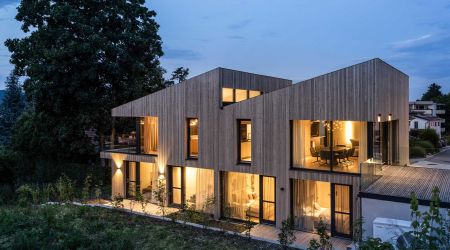 Holzständerbauweise mit Holzfaserdämmung Raumhohe Rahmenlose Dreifach- Festverglasungen, Raumhohe Fensterelemente im Erdgeschoss