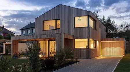Holzständerbauweise 240 mm mit Holzfaserdämmung + 60 mm Holzfaserplatten außen.