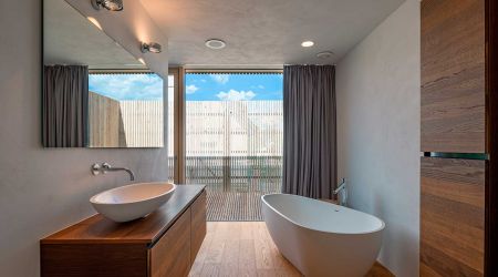 Holzständerbauweise 240 mm mit Holzfaserdämmung + 60 mm Holzfaserplatten außen. Raumhohe Rahmenlose Dreifach- Festverglasungen, Raumhohe Schiebetüren und Balkontüren in Weißtanne, Natur geölt.
