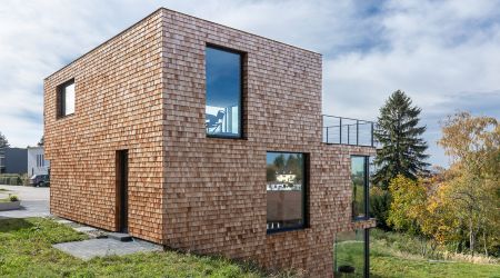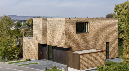 Dass Holzschindeln alles andere sind, als aus der Zeit gefallen, zeigt diese Interpretation einer traditionellen Bauweise. Die Fassade bildet einen außergewöhnlichen Kontrast zur modernen Bauweise.
