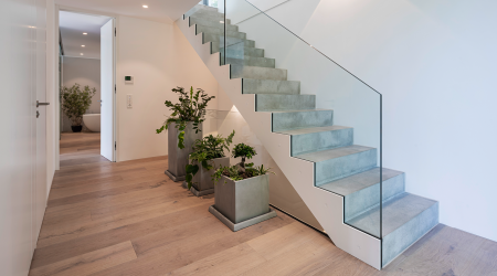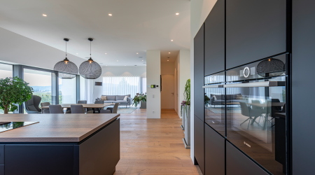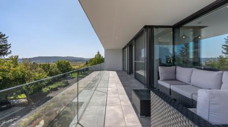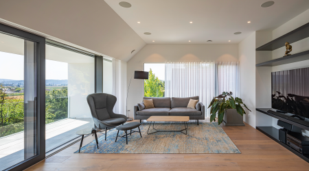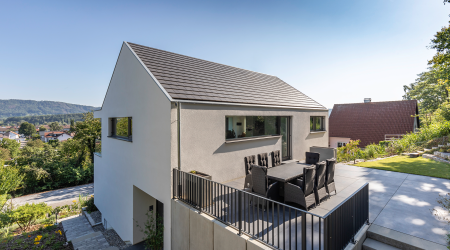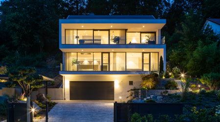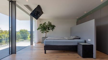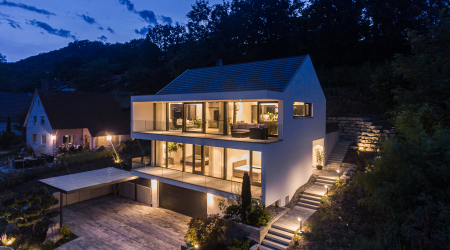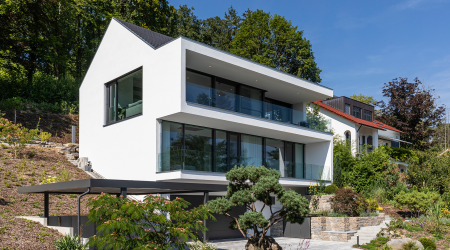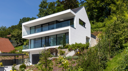 Hier trifft Eleganz auf Design. Dieses Haus ist ein echter Hingucker und schmiegt sich gleichermaßen an die Topographie der Umgebung an.