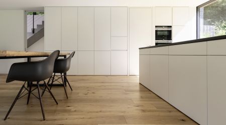 Raumhohe Rahmenlose Dreifach- Festverglasungen, Raumhohe Schiebetüren und Balkontüren in Weißtanne, Natur geölt.