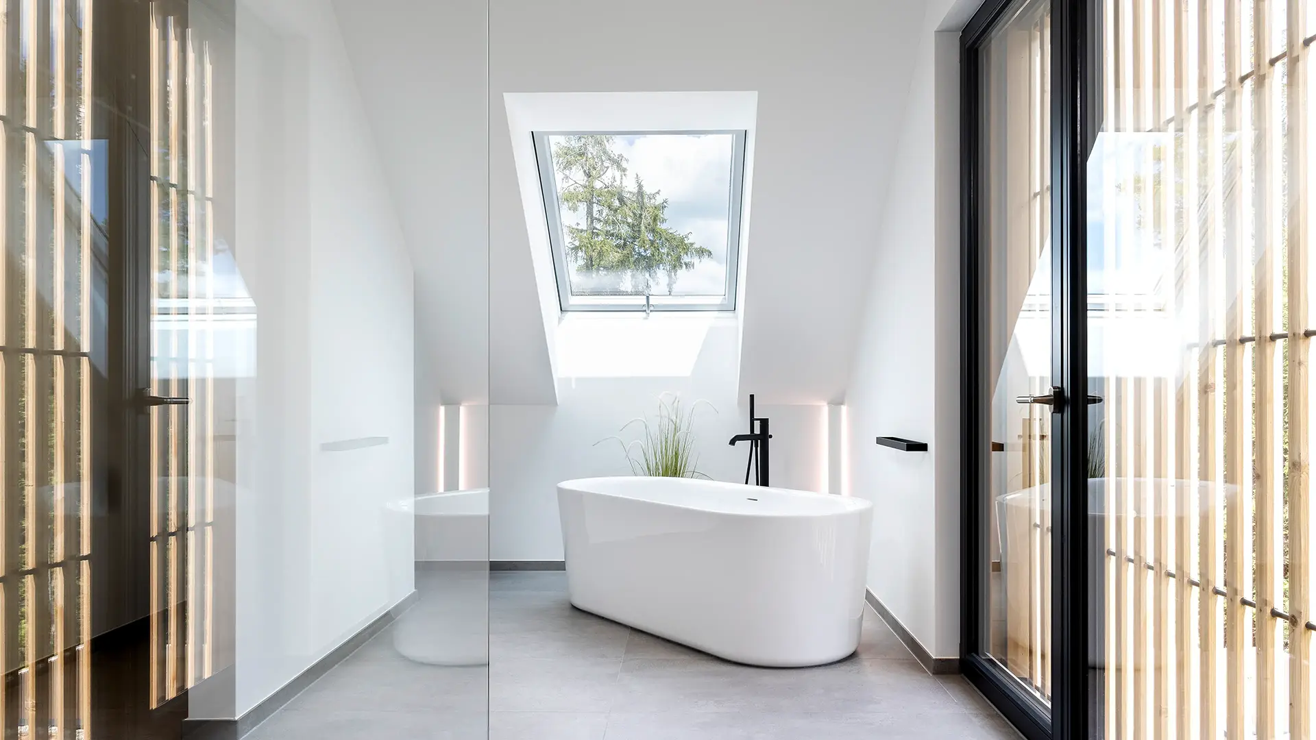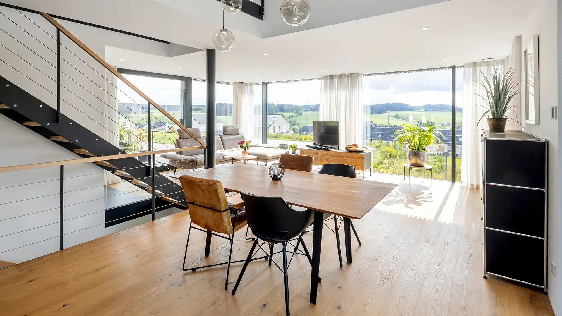 Holzständerbauweise mit Holzfaserdämmung, Raumhohe Rahmenlose Dreifach- Festverglasungen