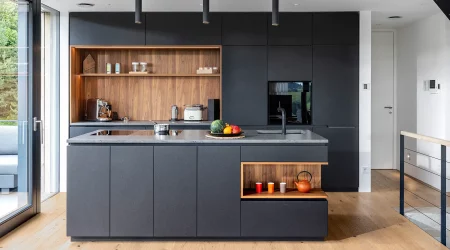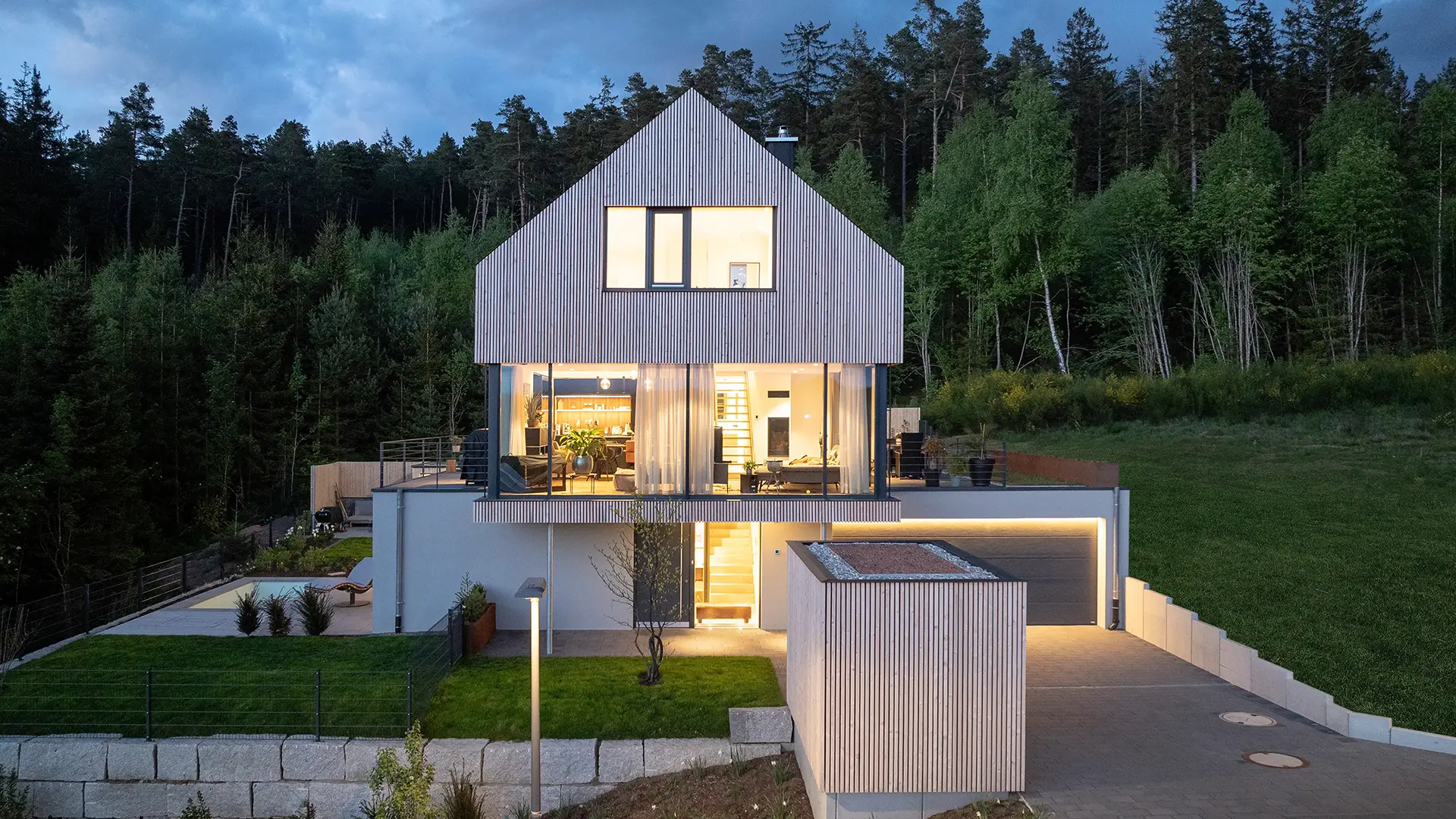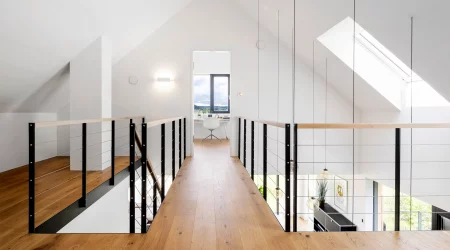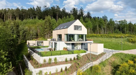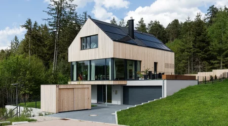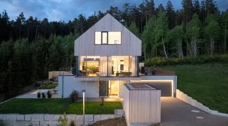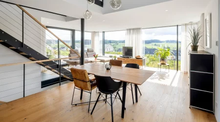Dieses außergewöhnliche Einfamilienhaus verbindet nachhaltige Holzbauweise mit zeitloser Architektur und macht es zu einem echten Wohlfühlort. Die warme Weißtannen-Fassade verleiht diesem Zuhause seinen unverwechselbaren Charakter. Raumhohe, rahmenlose Verglasungen öffnen die Räume zum Licht und schaffen eine einladende Atmosphäre zum Leben und Entspannen.
