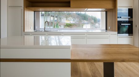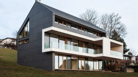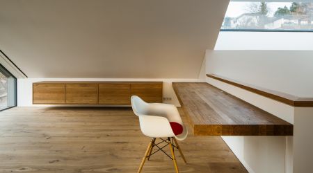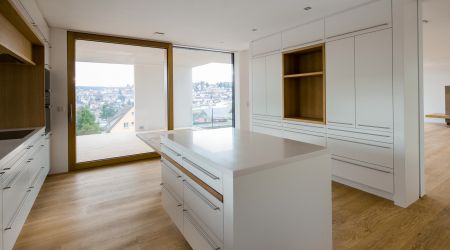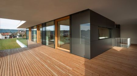 Im wunderschönen St. Georgen, dem Firmenstandort von Schwarzwälder, entstand in Holzständerbauweise ein modernes Passivhaus. Zementfaserplatten und weiß gestrichene Flächen unterstreichen den Designanspruch des Haus. In den Innenräumen dominiert der Baustoff, der uns am liebsten ist: Holz.