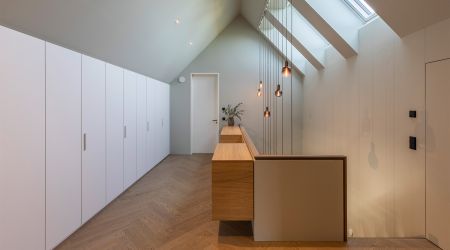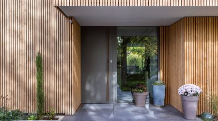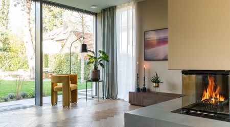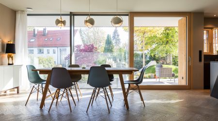 Raumhohe Rahmenlose Dreifach- Festverglasungen, Raumhohe Hebeschiebetüren in Weißtanne.